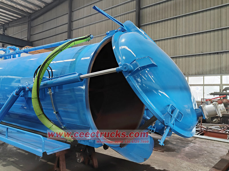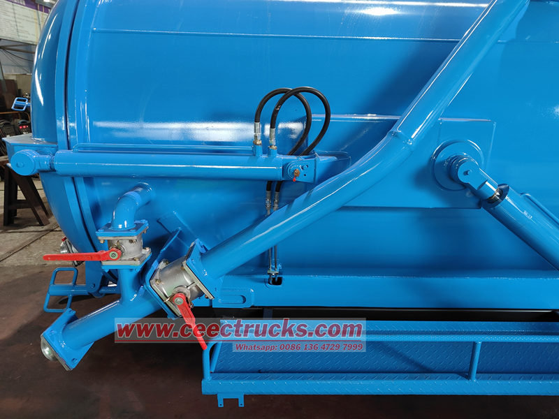 Le système de vide, qui comprend une pompe à vide et un séparateur huile-gaz, utilise la dépression pour extraire les déchets. Le réservoir est construit en acier haute résistance résistant à la corrosion et comporte une fenêtre d'inspection et un orifice d'alimentation pour le stockage des eaux usées. Le système de tuyauterie, comprenant les conduites d'aspiration et de refoulement ainsi qu'une vanne de régulation, assure le transfert des fluides. unité de citerne à vide montée sur camion Un système hydraulique soulève la cuve et ouvre le couvercle arrière, facilitant ainsi l'évacuation des eaux usées. La plateforme de commande est équipée de boutons et d'un manomètre pour un contrôle en temps réel.