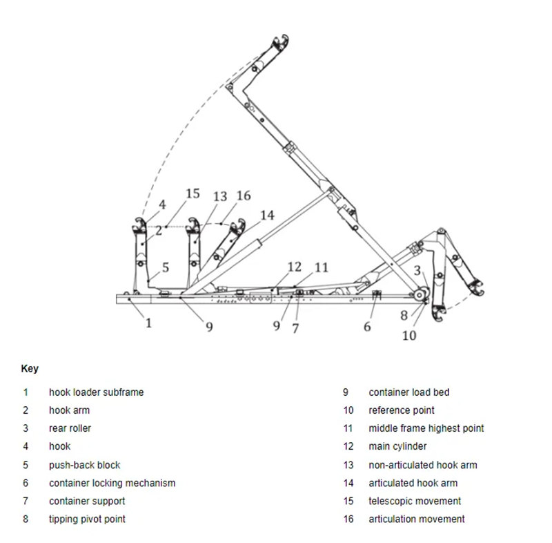 Le cycle de fonctionnement est le suivant : Lors du chargement, le bras de levage s'accroche au crochet avant du conteneur à déchets, et le système hydraulique tire le conteneur en douceur sur le châssis et le fixe. Lors du déchargement, le bras de levage repousse lentement le conteneur hors du châssis, le séparant ainsi pour faciliter son recyclage.