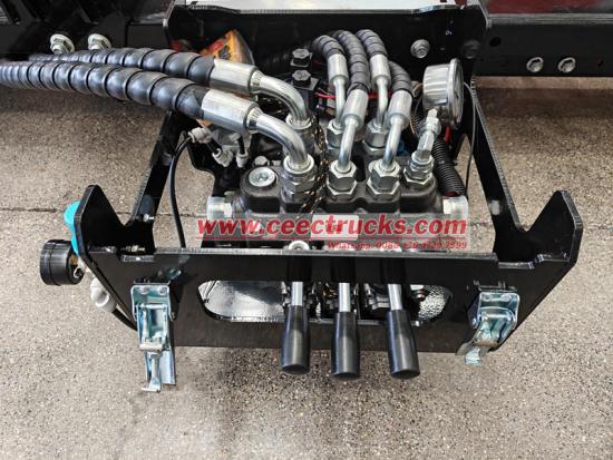 Cette huile haute pression est acheminée par des conduites hydrauliques vers les vérins hydrauliques, actionnant l'extension, la rotation et les mouvements de levage/abaissement du bras de crochet, tout en commandant l'ouverture et la fermeture du mécanisme de verrouillage pour accrocher, soulever et sécuriser la poubelle. L'ensemble du processus est contrôlé avec précision par le système hydraulique, garantissant un mouvement fluide et continu.