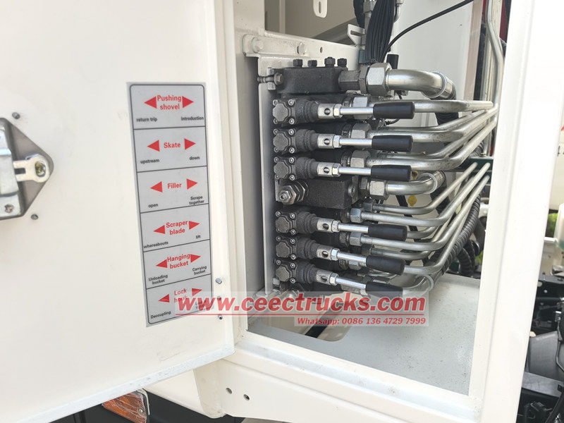 ● Lors du déchargement, le vérin de levage soulève la porte arrière du chargeur le long du trou de guidage pour la déverrouiller, et la plaque de poussée recule pour expulser les déchets. L'ensemble du processus est commandé par un seul bouton du système de commande électronique, garantissant efficacité et sécurité.