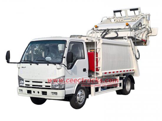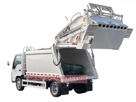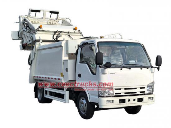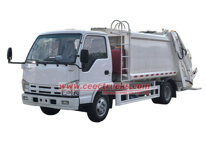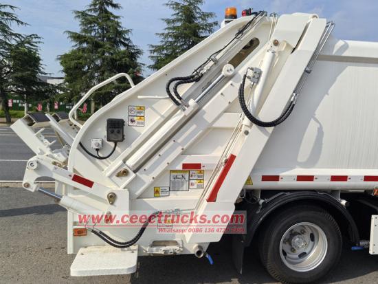 Le camion chargeur à compactage hydraulique Isuzu dispose d'une puissante fonction de compression qui peut compresser efficacement les déchets en vrac, augmenter la capacité de chargement et réduire la fréquence de transport. Avec un empattement de 3360 mm avec un moteur 4JB1CN 98 ch, une émission diesel Euro 4 de 2,771 L, une boîte de vitesses Isuzu MSB à 5 vitesses, des pneus 700R16 avec un total de 7 pièces, avec climatisation, USB, assistance de direction, 3 sièges. La partie supérieure est une poubelle de 6 m3, l'arrière est un mécanisme de basculement du godet, il existe 3 méthodes pour faire fonctionner le chargement et le déchargement du camion.