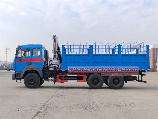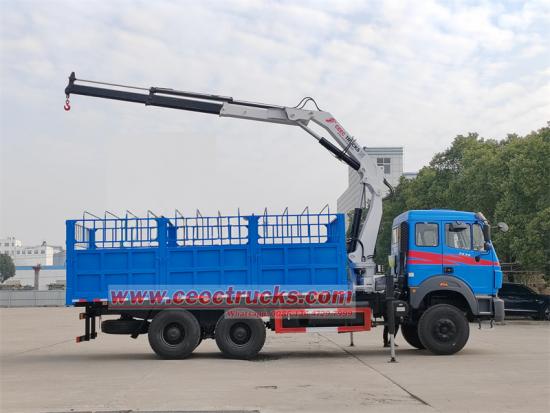 Equipped with XCMG SQ5ZK2Q knuckle boomCamion mobile Beiben 2638 avec grue Il s'agit d'un véhicule d'ingénierie multifonctionnel alliant transport efficace et levage flexible. Équipé d'un moteur WEICHAI de 380 ch et d'une boîte de vitesses rapide à 8 rapports, il est puissant et adaptable, et peut facilement affronter des conditions routières complexes. Son principal atout réside dans sa conception innovante bi-mode « transport + levage » : la caisse de chargement grillagée de 6,5 mètres répond aux besoins de chargement de marchandises en vrac, tandis que le système de grue à bras repliable permet des opérations de levage de 5 tonnes. Ce système offre les avantages d'une visibilité à 360°. ° Rotation complète, hauteur de travail de plus de 10 mètres et commande bilatérale, pour des opérations de levage plus flexibles et précises. La conception des stabilisateurs, d'une portée de plus de 5 mètres, assure la stabilité des opérations. Le limiteur de couple intégré, le dispositif de protection contre les surcharges et le système de mise à niveau automatique des stabilisateurs permettent de régler avec précision l'extension et la rétraction des stabilisateurs, l'extension et la rétraction de la flèche, la rotation et l'amplitude, ainsi que le levage du crochet et d'autres opérations.