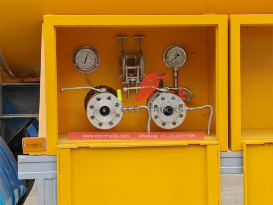 3 essieux avec pont BPW (13T), 12R22.5 12PR (13 pièces), pivot d'attelage JOST, jambe JOST (25T), indicateurs de niveau de liquide mécaniques, double manomètre, double thermomètre, double vanne de coupure d'urgence, quatre vannes à boisseau sphérique, double vanne de sécurité, deux boîtes à outils, sortie unique, double système de chargement et de déchargement, protection solaire en aluminium, 2 jeux d'extincteurs de 9 kg type ABC, 1 jeu d'extincteurs de 2 kg type CO2, 3 jeux de plaques de signalisation de danger, 2 jeux de plaques numérotées orange, débitmètre avec imprimante |
