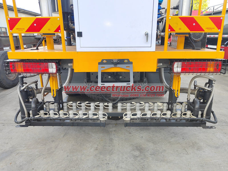 L'arrière du véhicule est équipé d'une rampe de pulvérisation rétractable (longueur réglable de 2 à 6 mètres), équipée d'une pompe centrifuge haute pression et d'une buse en éventail. La largeur et le débit de pulvérisation sont réglables en continu (de 0,3 à 3 l/m²) via l'ordinateur de bord pour répondre aux exigences de différents procédés tels que l'application de revêtements pénétrants, d'enductions d'accrochage et d'enductions de scellement.