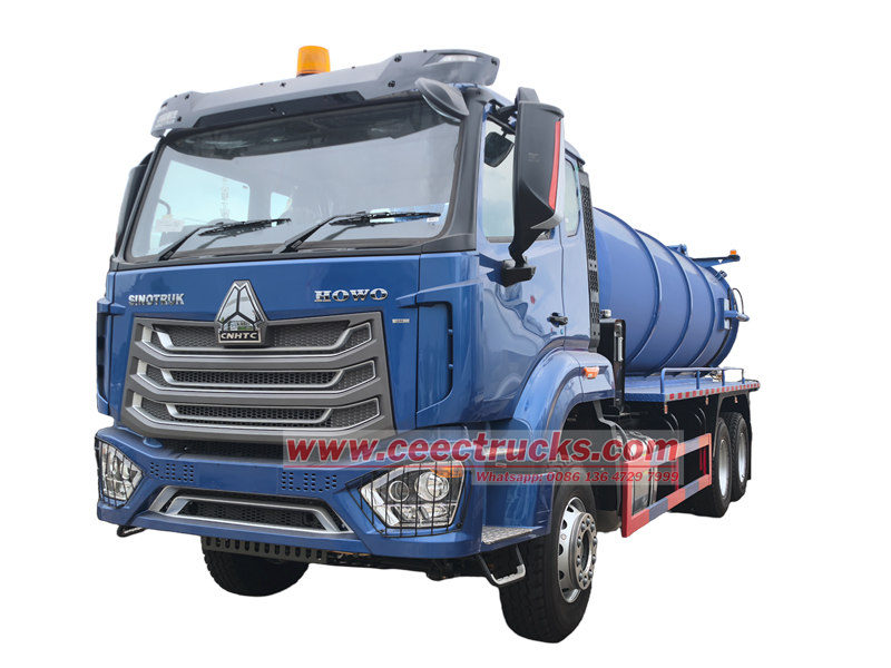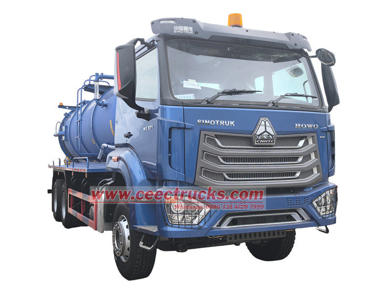 La benne de vidange de fosses septiques Howo de 15 m³ est une version modifiée du châssis HOWO NX Cabin 6x4, avec un empattement de 4 325 + 1 350 mm, chaussée de 11 pneus 315/80R22.5, et équipée de la climatisation, d'un port USB et d'un système d'assistance à la direction. Son moteur diesel WP12.400E32 de 400 ch, associé à une transmission HW19710 à 10 vitesses avant et 2 vitesses arrière, ainsi qu'à une direction ZF8118, lui confère puissance et facilité d'utilisation. Dotée d'une cuve à vide de 15 m³, elle répond à divers besoins de dragage, notamment pour les égouts urbains et les canalisations industrielles.