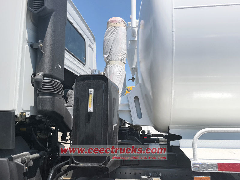 Le camion-citerne sous vide Howo de 20 000 litres est basé sur le châssis HOWO 6x4, avec un empattement de 4 325 + 1 350 mm, chaussé de 11 pneus 12.00R20, et équipé d'un moteur diesel WP12.400E32 de 400 ch, d'une boîte de vitesses HW19710 à 10 rapports avant et 2 rapports arrière, et d'une direction ZF8198. Puissant et facile à manœuvrer, il est doté des fonctions d'auto-amorçage, d'auto-vidange et d'auto-déchargement. Grâce à sa forte aspiration et à son rendement élevé, la citerne peut être remplie et vidée rapidement et efficacement en une seule opération.