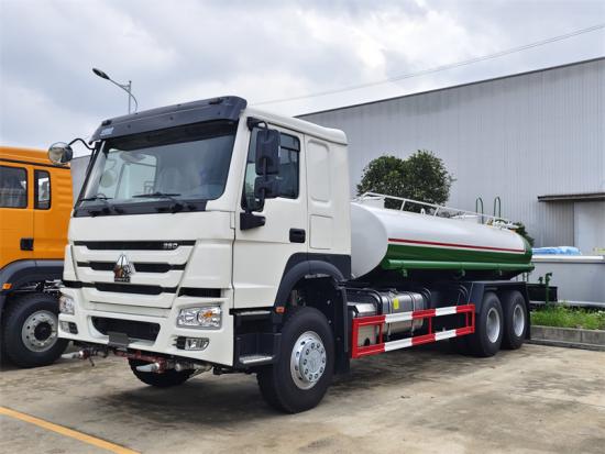 HOWO HW76, NX cabin is optionalLe camion-citerne HOWO 6×4 est un véhicule d'assainissement écologique multifonctionnel, modifié sur le châssis moteur SINOTRUK HOWO ZZ1257 6×4. Il est équipé d'une cuve à eau en acier au carbone de 20 000 litres, d'une pompe à eau de type 80QZ60/90 et d'un système d'arrosage. Le véhicule s'amorce automatiquement à partir de sources externes grâce à sa pompe embarquée, puis transporte l'eau sous pression vers des arroseurs situés à l'avant, à l'arrière et sur les côtés, ainsi que vers un canon à eau d'une portée supérieure ou égale à 35 mètres, permettant différents modes de pulvérisation.