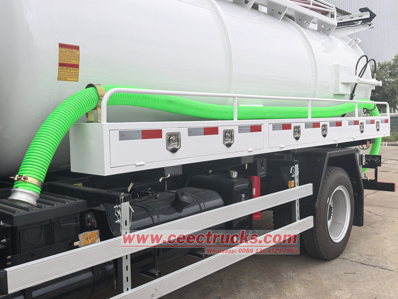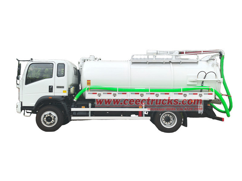 ➤ Le camion-citerne à vide Howo de 5 000 litres est doté de fonctions d’auto-amorçage, d’auto-vidange et d’auto-déchargement, pompant rapidement les déchets des fosses septiques dans une cuve et les déchargeant par vidange hydraulique ou sous pression.