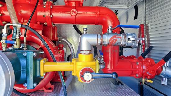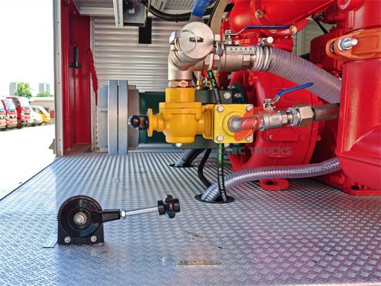 Panneau de commande de la pompe à eau en anglais, le garde-boue doit être noir, avec voyant d'alarme, échelle amovible, boîte d'équipement arrière de la carrosserie sous la direction de l'inclinaison vers le haut d'environ 45 degrés, toutes les interfaces du véhicule et les accessoires sont britanniques, avec un rouleau de 30 m de tuyau haute pression noir |