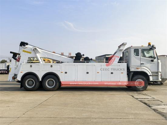 Ce lourd duty wrecker, built by CEEC Trucks Group, utilizes the Howo NX cabin 6 x 4 drive chassis and is equipped with a powerful Howo WP10.340E22 diesel engine (3 4 0 HP /1250N . m of torque) and an HW1 9710 10 -speed transmission. Combined with an HF9-ton front axle and HC16-ton rear axle, it ensures exceptional power, load-bearing capacity, and reliability. It incorporates two 1 2 ton s hydraulic winches, resulting in an impressive rated towing capacity of 30 tons, making it ideal for handling accidents involving large trucks, buses, and construction machinery.