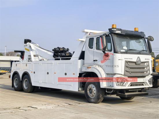 With two 10tons hydraulic winchesCe heavy duty wrecker , built by CEEC Trucks Group, utilizes the Howo NX cabin 6 x 4 drive chassis is equipped with a powerful WP10.340E22 diesel engine,3 4 0 HP /1250N . m of torque,HW1 9710 10 -speed transmission. Combined with an 9 ton front axle and 16 ton rear axle, it ensures exceptional power, load-bearing capacity, and reliability. It incorporates two 1 2 ton s hydraulic winches, resulting in an impressive rated towing capacity of 18 tons, making it ideal for handling accidents involving large trucks, buses, and construction machinery.