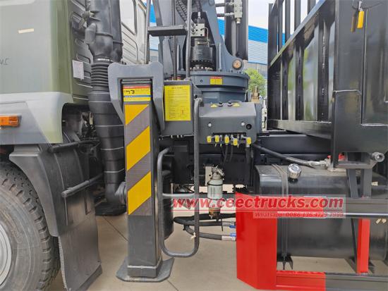 ● Disposition de la grue : La grue à bras droit XCMG KSQS200-4 est installée à l'avant de la benne. La tourelle est fixée au châssis par des boulons, et un contrepoids est prévu pour améliorer la stabilité. La disposition de la benne et de la grue a été calculée en fonction du centre de gravité afin de garantir une répartition optimale de la charge par essieu pendant la conduite.