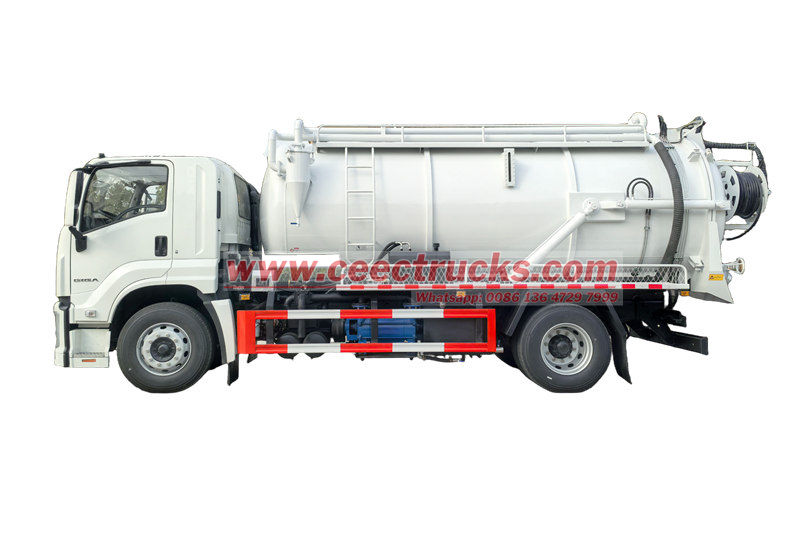 Le camion aspirateur combiné Isuzu GIGA (également appelé camion aspirateur, camion de nettoyage des eaux usées, camion aspirateur d'eaux usées, camion aspirateur de 10 000 litres, etc.) est utilisé pour collecter, transporter et décharger des liquides tels que l'eau sale, les boues, les fosses septiques, le pétrole brut et les matières solides telles que les petites pierres, les briques également.