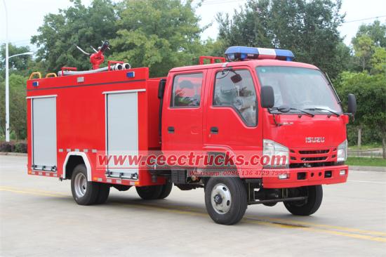 4WD offroad type for tough road conditionTout nouveau designMini camion de pompiers ISUZUIl est composé d'un châssis de camion ISUZU de type II, d'un réservoir d'eau SS304, d'une pompe à eau, d'un canon à eau, d'une canalisation, d'un système de circuit d'instruments et d'autres composants.Camion de pompiers IsuzuLe véhicule est équipé d'une échelle arrière amovible en alliage d'aluminium. Le compartiment de la pompe se trouve à l'arrière du véhicule. Le réservoir d'eau est fabriqué en acier inoxydable n° 304, soudé automatiquement, et son intérieur est traité anticorrosion.Camion de pompiers à réservoir d'eau ISUZUSa capacité est de 3 mètres cubes, soit 800 gallons. Il est équipé d'une pompe à incendie modèle CB0/30 avec un débit de 1 800 l/min à 10 bar et d'un moniteur d'incendie d'une capacité de 1 200 l/min à 0,8 bar.Le Le châssis ISUZU pour pompiers est doté d'une cabine à deux rangées, de quatre portes et de deux rangées pouvant accueillir six passagers. Les sièges arrière sont équipés d'un appareil respiratoire autonome (ARI) spécialement conçu pour la lutte anti-incendie en groupe. Le moteur diesel ISUZU 4KH1CN6LB à commande électronique précise et rampe commune haute pression offre une puissance accrue, une consommation d'huile réduite, une meilleure adaptabilité et un meilleur démarrage à basse température. Le réservoir est doté d'un réservoir hautement résistant à la corrosion.