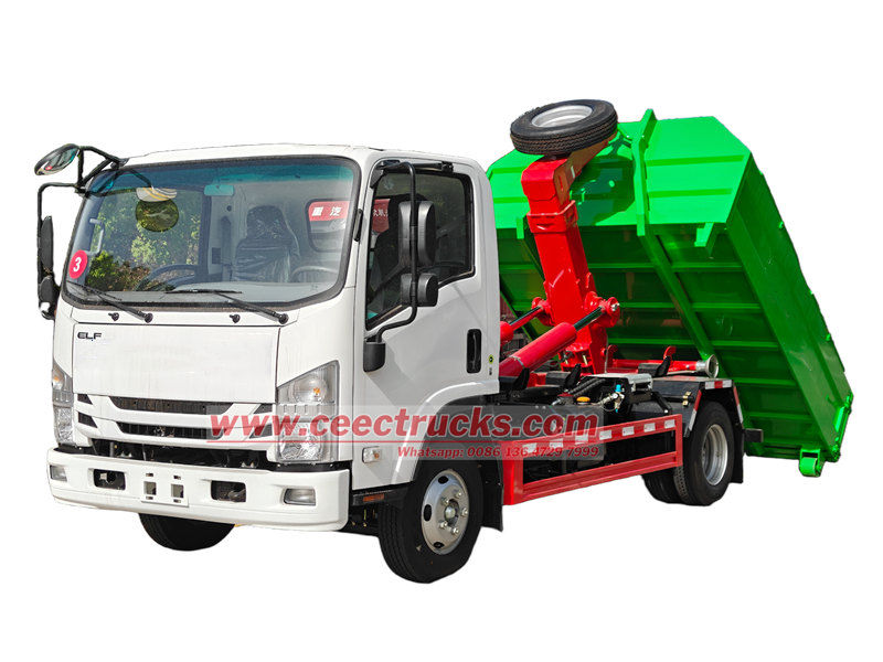 Camion à crochet Isuzu 5 tonnes également appelé Camion poubelle à bras oscillant Isuzu ELF, camion élévateur à crochet Isuzu NPR, chargeur à crochet Isuzu, camion poubelle à bras à crochet Isuzu 190 ch, camion à benne basculante Isuzu ELF, camion chargeur à crochet à 6 roues Isuzu, etc. Le véhicule est modifié sur le châssis Isuzu ELF, empattement de 3360 mm, équipé d'un puissant moteur diesel Isuzu 4HK1-TCG61 et d'une boîte de vitesses Isuzu MLD à 6 rapports, puissante et fluide, assurant d'excellentes performances de conduite et une stabilité de fonctionnement.