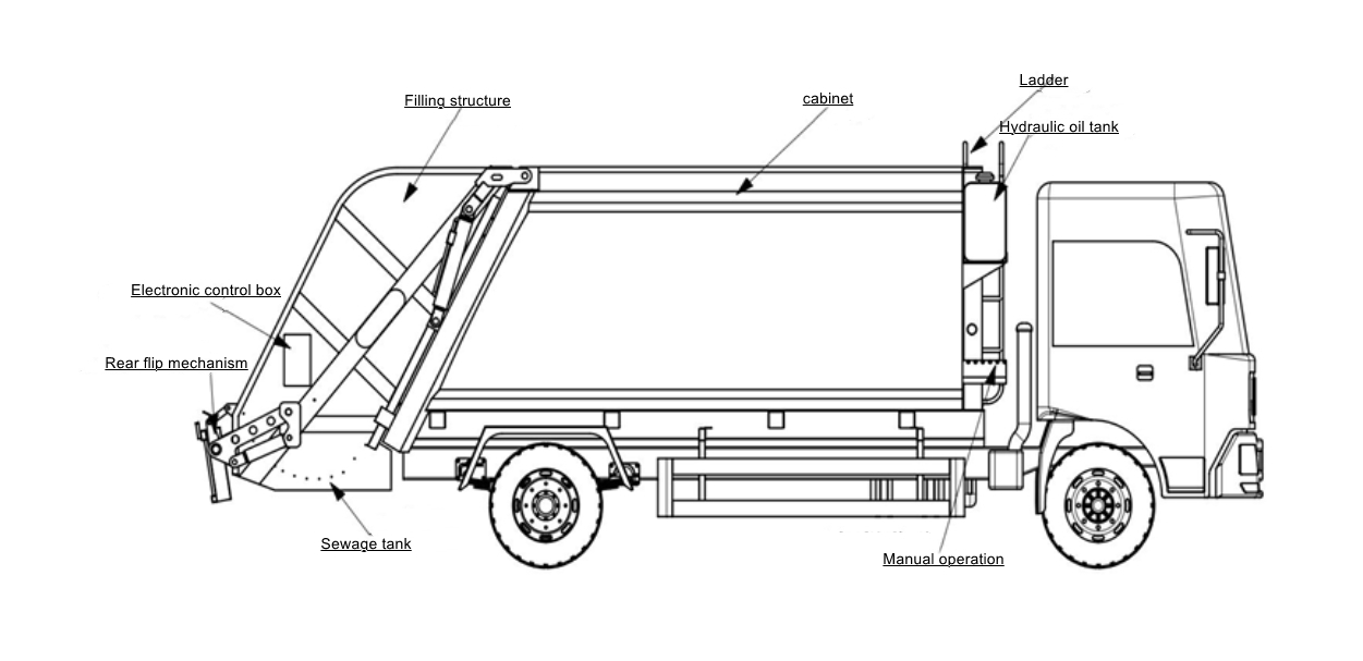 La structure supérieure comprend un réservoir de déchets comprimé en acier en carbone de 10 mètres cubique avec une épaisseur latérale de 4 mm et une épaisseur de fond de 5 mm, ce qui est durable et a une grande capacité Le corps compacteur incurvé est équipé de cylindres hydrauliques de marque chinoise de qualité supérieure Hefei Wanye pour assurer une compression puissante et fiable