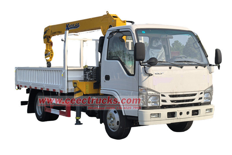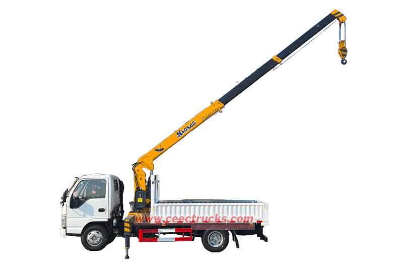 La grue de chargement Isuzu ELF 3,2 tonnes offre une large gamme de tonnages optionnels, allant de 2 tonnes, 3,2 tonnes, 4 tonnes, jusqu'à 30 tonnes. Les clients ont le choix entre une grue à bras droit ou une grue à bras repliable.