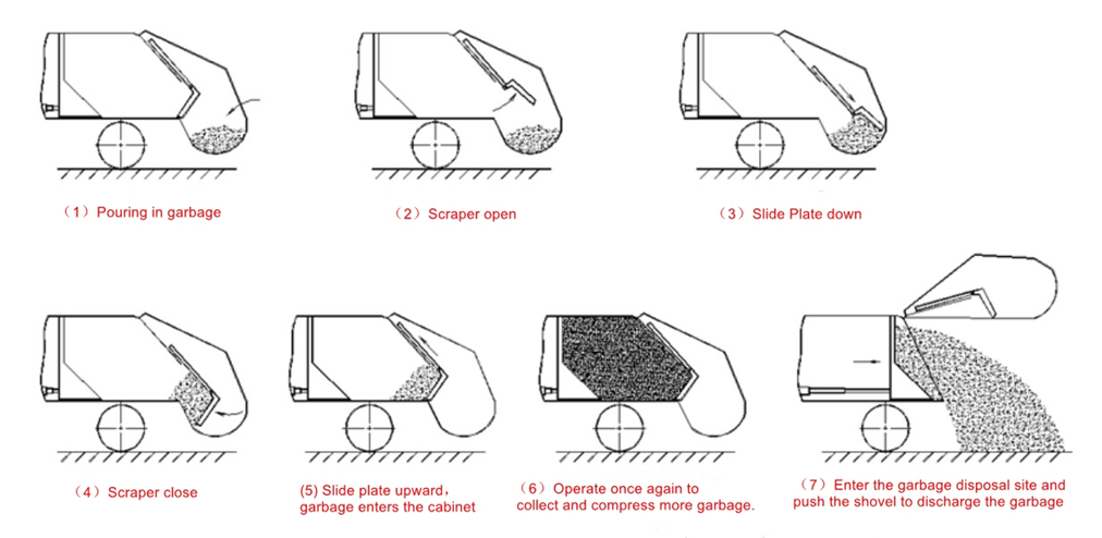Le processus de travail du camion à ordures de compression est illustré sur la figure