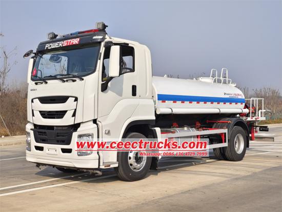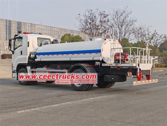 10CBM water tank capacityLe camion ISUZU FTR 10 cube mètre cube est modifié sur le nouveau châssis Isuzu Ftr Giga 4X Il est équipé d'un puissant moteur 4 cylindres en ligne 4HK1-TCG60 et d'une boîte de vitesses MLD à 6 vitesses, offrant une sortie de sortie stable et efficace La partie supérieure est un réservoir d'eau en acier en carbone à grande capacité de 10 cubes, qui intègre la buse d'eau avant, la buse d'eau arrière et le canon à eau arrière pour obtenir une pulvérisation de précision multi-modes polyvalente pour répondre à différents besoins opérationnels La queue du réservoir est également équipée d'un JBQ5 5/9 0 Pompe à incendie portable Entièrement pour améliorer la capacité de manipulation d'urgence
