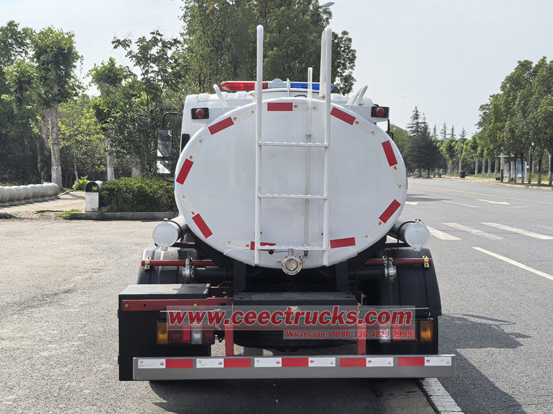 Camion-citerne tractable Isuzu KV100 avec arroseur. Il est équipé d'un nouveau châssis Isuzu KV100, d'un moteur 4KH1CN6LB de 120 ch, d'un 4 cylindres en ligne 4 temps et d'une boîte de vitesses Isuzu MSB à 5 rapports. La partie supérieure est un réservoir d'eau en acier inoxydable de 5 m3. Il est équipé d'un filtre en acier inoxydable et d'une pompe à eau 40/50 en acier inoxydable. Des feux d'avertissement rouges et bleus sont installés sur le dessus de la cabine.