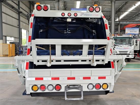 Semi-sealed bucket flip mechanismÈme et Le camion compacteur à déchets léger ISUZU NPR est un camion-benne urbain aux performances exceptionnelles. Il est équipé d'un moteur 4HK1-TCG61 développant une puissance maximale de 190 chevaux et une cylindrée de 5,19 L. Il est équipé d'un moteur 4 cylindres en ligne turbocompressé avec refroidisseur intermédiaire. Son poids total est de 11 tonnes et sa capacité de charge réelle de 4,9 tonnes. Son châssis est à transmission intégrale et son empattement est de 3815 mm. La poubelle, d'une capacité de 10 m³, est fabriquée en tôles d'acier intégrales courbées. Les plaques inférieures et latérales sont en acier spécial Q235 de 4 mm d'épaisseur, et son taux de compression atteint 1:3,4.